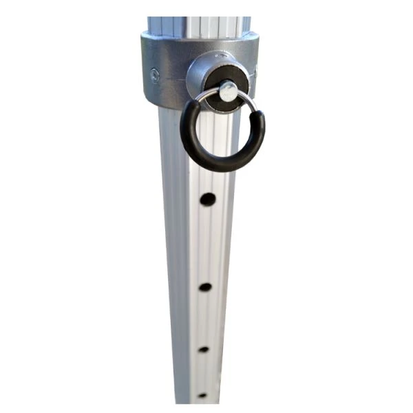 - Hexagonal profile industrial alloy tubing, 58mm diameter / Internal concertina x-bars ribbing / Galvanised steel footplates / 5 position height adjustment in 75mm increments, Min. height (valance): 190cm, Max height (valance): 220cm, Min. height (apex): 327cm, Max. height (apex): 357cm / Quick release pull-pin brackets / Cast alloy brackets / No plastic brackets / Canopy securing bolts / Supplied with H/D cover bag or optional H/D wheeled storage bag / Supplied with H/D camlock straps & stakes