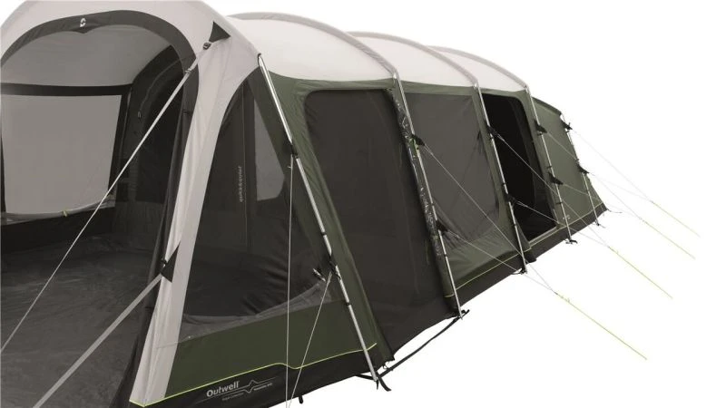 Not only does the tent come with high-vis guylines, but also ‘Storm Ties’ Velcro around the 19mm steel poles to make sure the fabric and poles are tensioned together, while storm straps are provided front and back to increase stability. Outwell have really gone to town on including things like their own HookTrack System to give you the option to have a hanging point for lights or storage pockets throughout the tent. ‘Quick & Quiet’ Access doors are located on the bedroom compartment and the living room door. Premier Bedrooms which are nice and dark and have a Rear Ventilation System built in to increase the airflow and help reduce condensation (this can be covered to keep the bedroom nice and dark if needed).