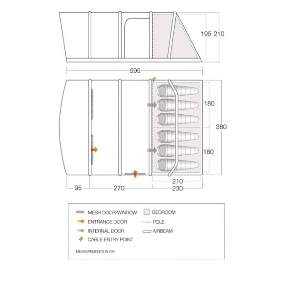 The Aether Air has a varied number of features such as a Pre attached Open Extension to give the user shelter from the wind, not to mention Dark ‘Nightfall Bedrooms’ to stop you waking up when the sun does, two mesh doors leading out of the living area which helps to keep insects out. Vango’s Villa Construction beams not only make it easy to inflate but roomy as the upright side wall increase height and allows furniture to be moved closer to the edge of the tent. Crystal Clear windows allow plenty of light into the tent while toggle up curtains give privacy as and when needed.