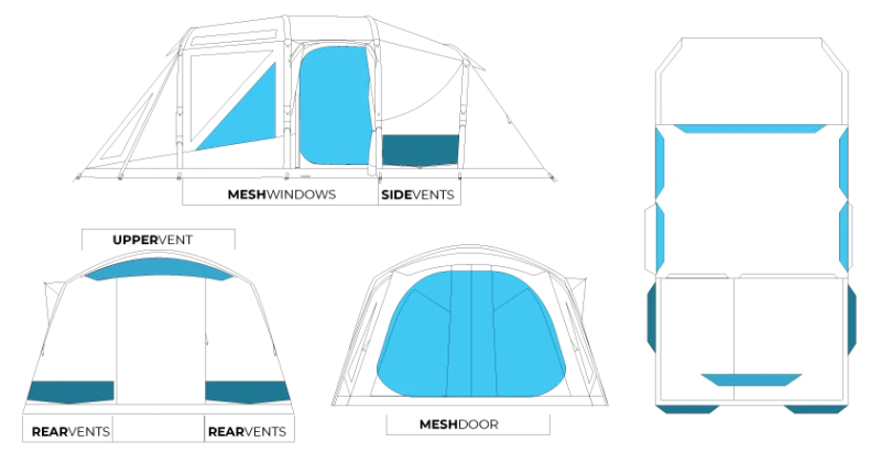 - Awning Features – 3 Stage Door, Awning Poles Included, All-Weather Access, Extended Awning Area, Roll Up Awning Door, Removable Anchor Webbing, Rain Skirt Fold Away Toggles, Rain Skirt, Gullwing Awning, Twin Access Awning Doors